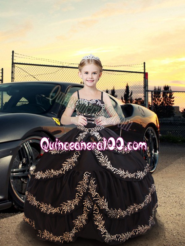 Neckline : Spaghetti strapsShown Color : BlackSilhouette : Ball GownsSleeve Length : sleevelessHemline : floor lengthBack Detail : Lace upFabric : TaffetaEmbellishment : Embroidery,Ruffled LayersOccasion : Quinceanera,Wedding PartySeason : Spring,Summer,Fall,Winter