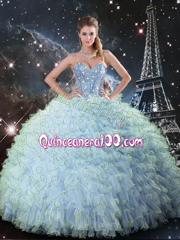 Neckline : SweetheartShown Color : Aqua BlueSilhouette : Ball GownsSleeve Length : sleevelessHemline : floor lengthBack Detail : Lace upFabric : OrganzaEmbellishment : Beading,RufflesOccasion : Military Ball,Sweet 16,QuinceaneraSeason : Spring,Summer,Fall,Winter