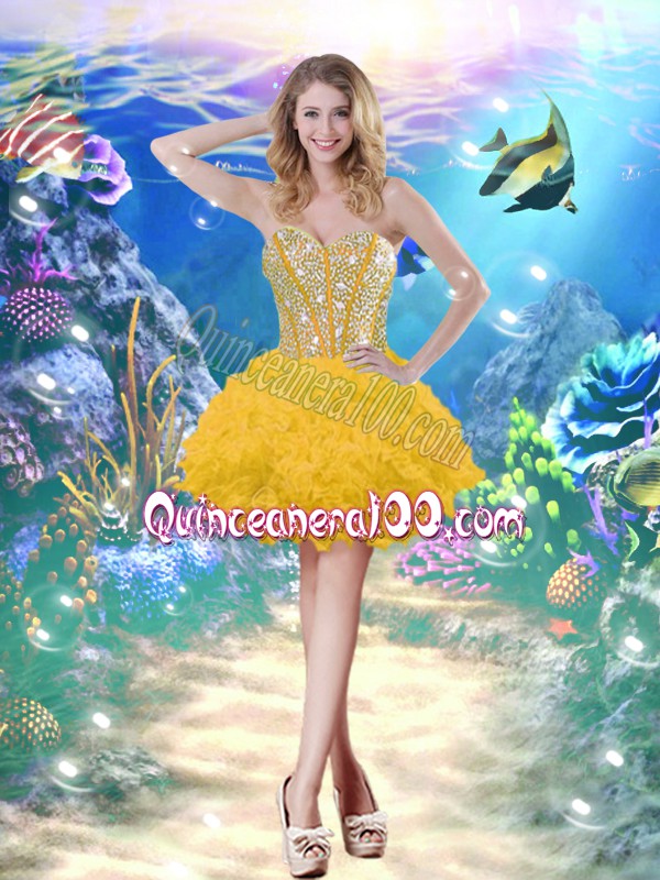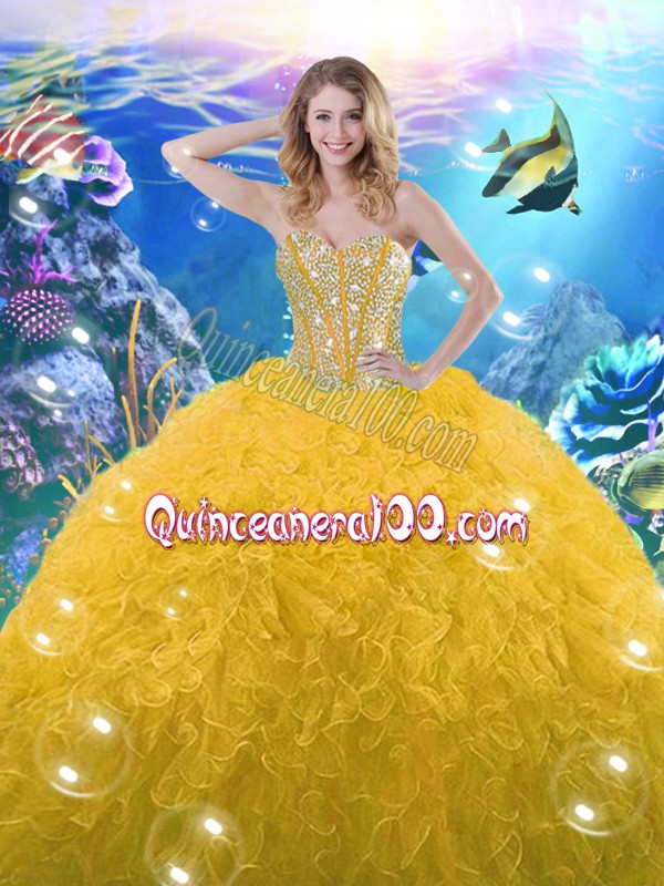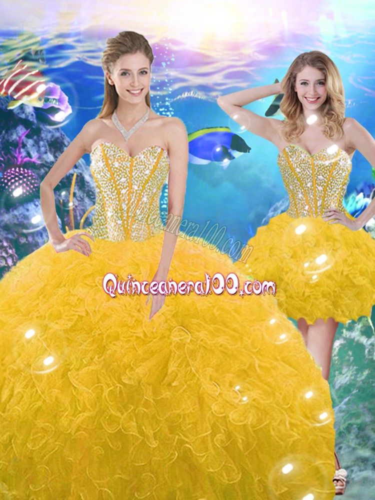 Gold Organza Lace Up Quinceanera Gowns Sleeveless Floor Length Beading and Ruffles