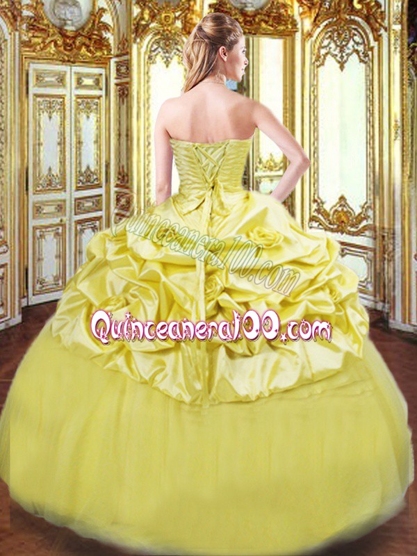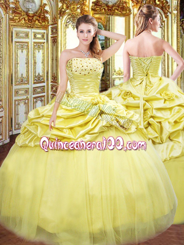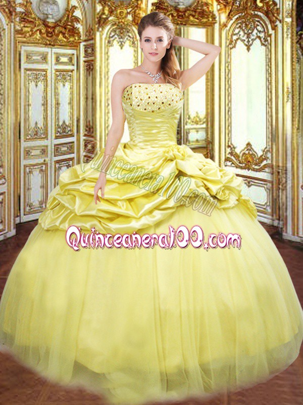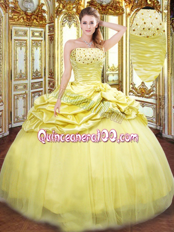 Neckline : StraplessShown Color : GoldSilhouette : Ball GownsSleeve Length : sleevelessHemline : floor lengthBack Detail : Lace upFabric : TaffetaEmbellishment : Beading,Pick UpsOccasion : Military Ball,Sweet 16,QuinceaneraSeason : Spring,Summer,Fall,Winter