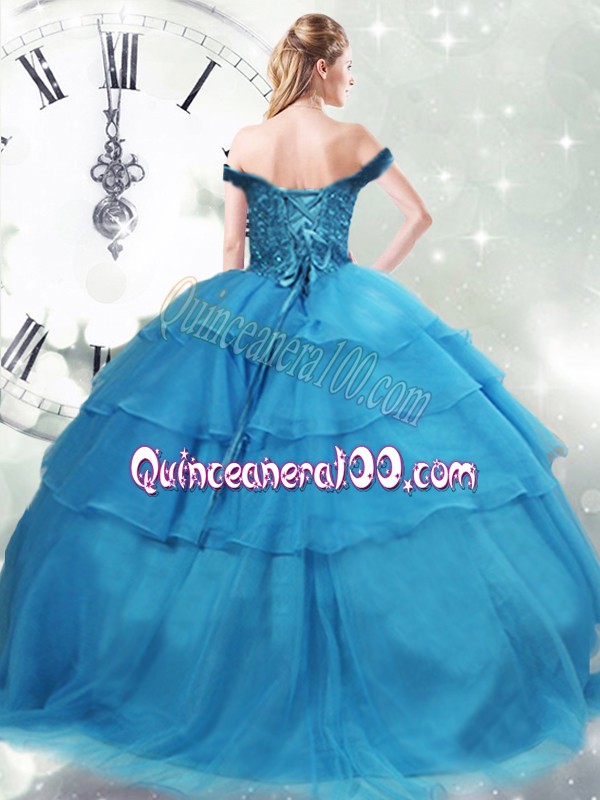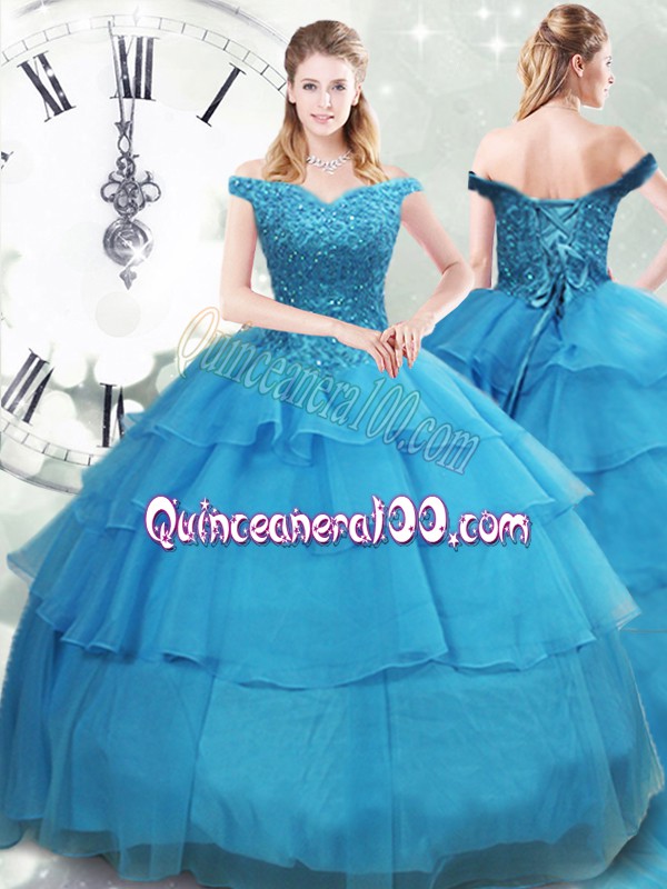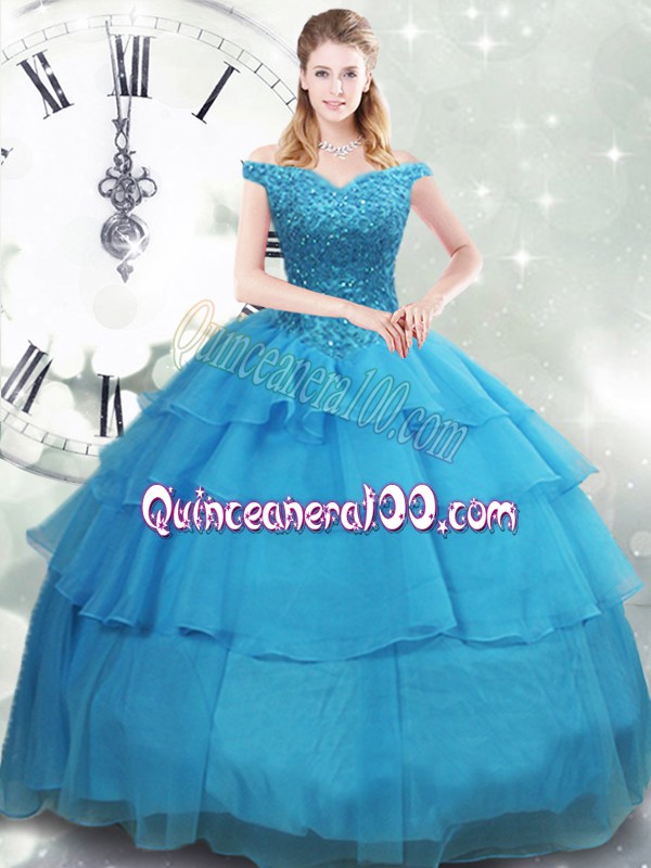 Neckline : Off the shoulder Shown Color : Baby Blue Silhouette : Ball Gowns Sleeve Length : sleeveless Back Detail : Lace up Fabric : Organza Embellishment : Beading,Ruffled Layers Occasion : Military Ball,Sweet 16,Quinceanera Season : Spring,Summer,Fall,Winter
