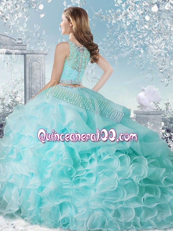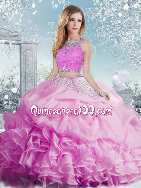 Neckline : ScoopShown Color : LilacSilhouette : Two PiecesSleeve Length : sleevelessHemline : floor lengthBack Detail : Clasp handleFabric : OrganzaEmbellishment : Beading,Ruffles,Pick UpsOccasion : Military Ball,Sweet 16,QuinceaneraSeason : Spring,Summer,Fall,Winter