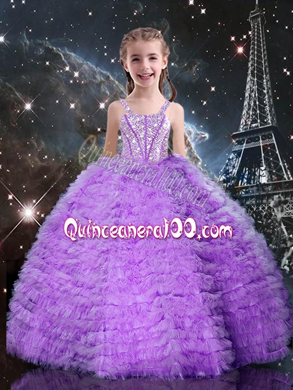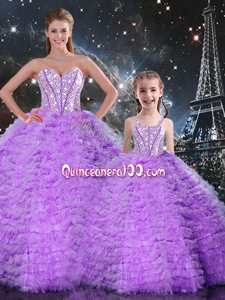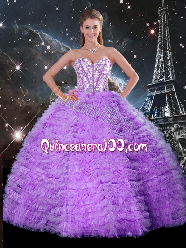 Neckline : SweetheartShown Color : LavenderSilhouette : Ball GownsSleeve Length : sleevelessHemline : floor lengthBack Detail : Lace upFabric : TulleEmbellishment : Beading,RufflesOccasion : Military Ball,Sweet 16,QuinceaneraSeason : Spring,Summer,Fall,Winter