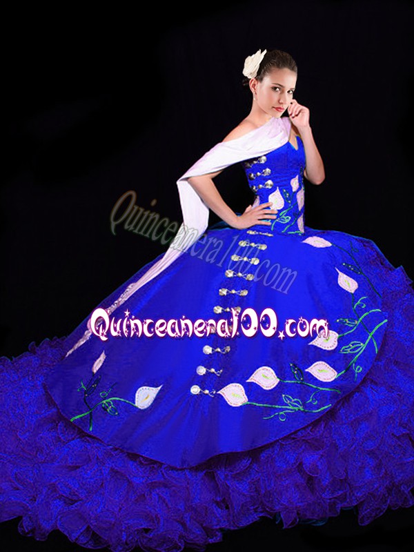 Neckline : Sweetheart Shown Color : Royal Blue Silhouette : Ball Gowns Sleeve Length : sleeveless Back Detail : Lace up Fabric : Organza Embellishment : Embroidery Occasion : Military Ball,Sweet 16,Quinceanera Season : Spring,Summer,Fall,Winter