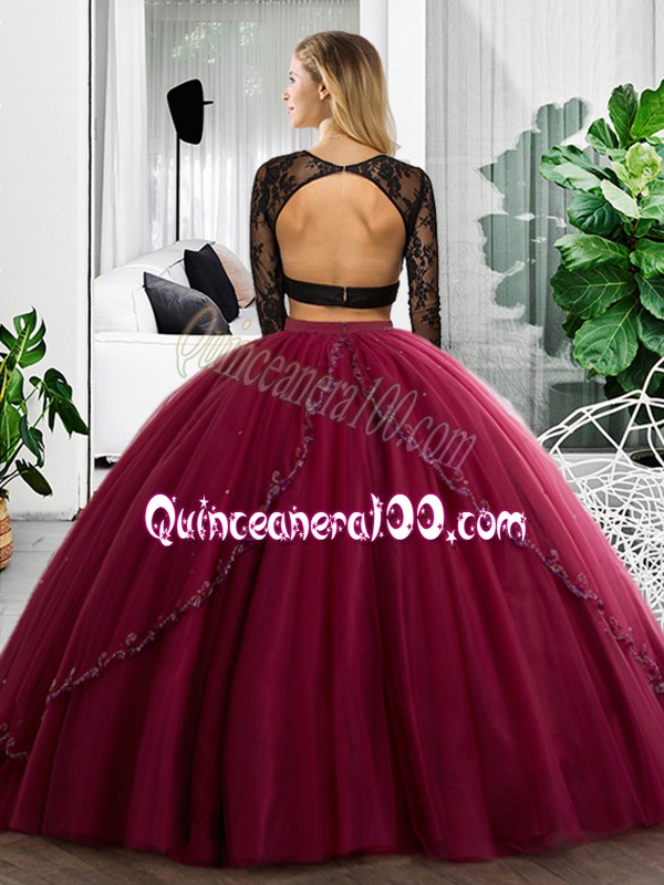 Neckline : ScoopShown Color : BlueSilhouette : Two PiecesSleeve Length : long sleevesHemline : floor lengthBack Detail : BacklessFabric : TulleEmbellishment : Lace,RuchingOccasion : Military Ball,Sweet 16,QuinceaneraSeason : Spring,Summer,Fall,Winter