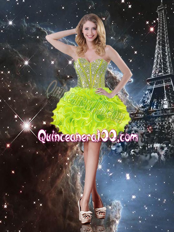 Neckline : SweetheartShown Color : Yellow GreenSilhouette : Ball GownsSleeve Length : sleevelessHemline : floor lengthBack Detail : Lace upFabric : OrganzaEmbellishment : Beading,RufflesOccasion : Military Ball,Sweet 16,QuinceaneraSeason : Spring,Summer,Fall,Winter