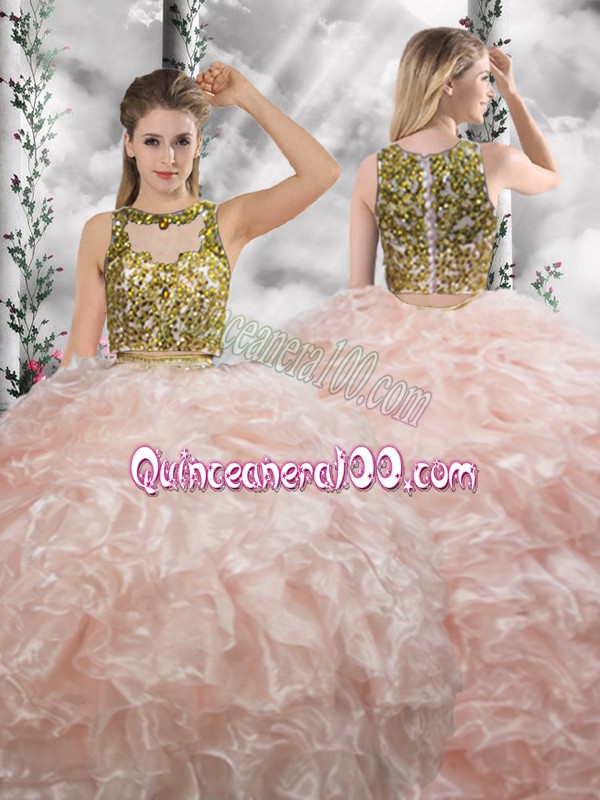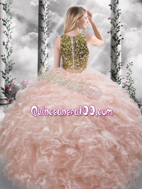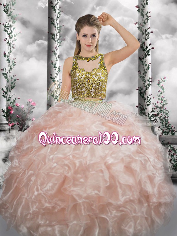 Neckline : ScoopShown Color : PeachSilhouette : Two PiecesSleeve Length : sleevelessHemline : floor lengthBack Detail : ZipperFabric : OrganzaEmbellishment : Beading,RufflesOccasion : Military Ball,Sweet 16,QuinceaneraSeason : Spring,Summer,Fall,Winter