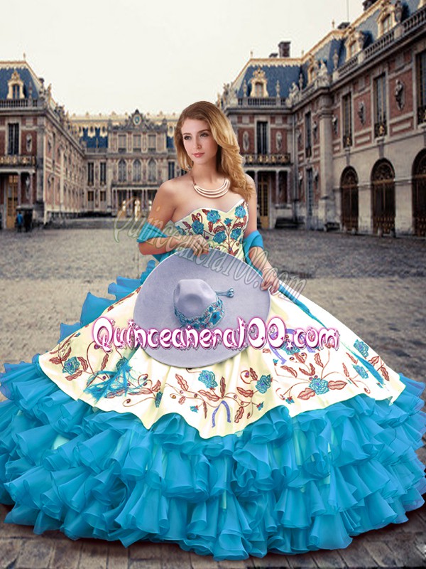Neckline : SweetheartShown Color : Aqua BlueSilhouette : Ball GownsSleeve Length : sleevelessHemline : floor lengthBack Detail : Lace upFabric : OrganzaEmbellishment : Embroidery,Ruffled LayersOccasion : Military Ball,Sweet 16,QuinceaneraSeason : Spring,Summer,Fall,Winter