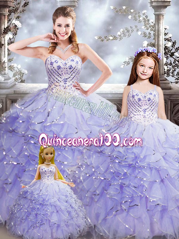 Neckline : SweetheartShown Color : LavenderSilhouette : Ball GownsSleeve Length : sleevelessHemline : floor lengthBack Detail : Lace upFabric : OrganzaEmbellishment : Beading,RufflesOccasion : Military Ball,Sweet 16,QuinceaneraSeason : Spring,Summer,Fall,Winter