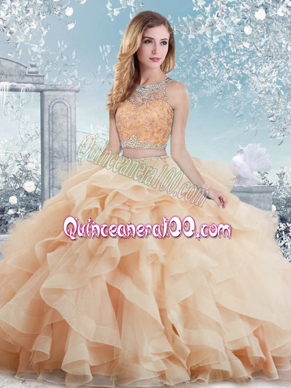 Neckline : ScoopShown Color : PeachSilhouette : Ball GownsSleeve Length : sleevelessHemline : floor lengthBack Detail : Clasp handleFabric : OrganzaEmbellishment : Beading,RufflesOccasion : Military Ball,Sweet 16Season : Spring,Summer,Fall,Winter