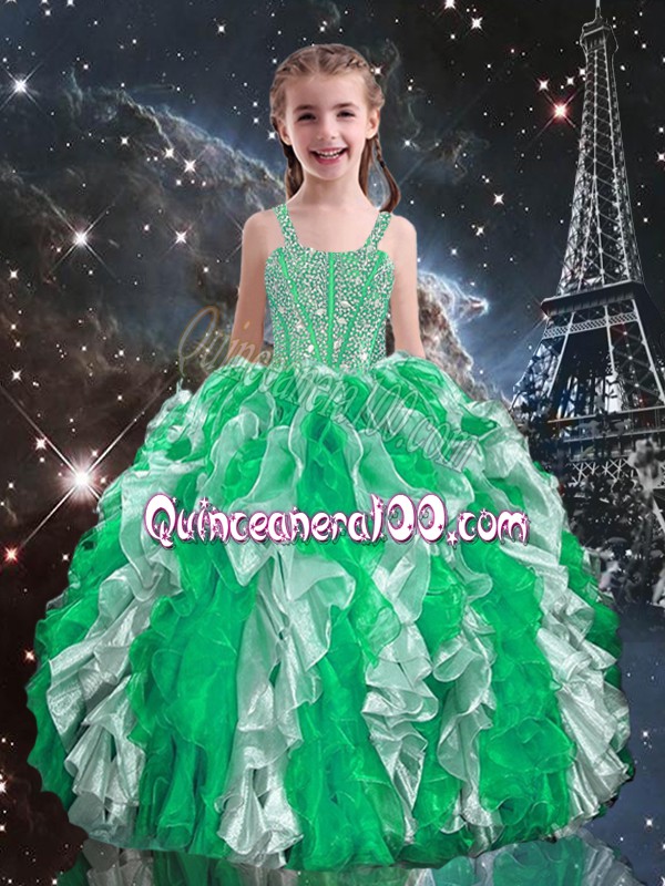 Neckline : StrapsShown Color : GreenSilhouette : Ball GownsSleeve Length : sleevelessHemline : floor lengthBack Detail : Lace upFabric : OrganzaEmbellishment : Beading,RufflesOccasion : Quinceanera,Wedding PartySeason : Spring,Summer,Fall,Winter