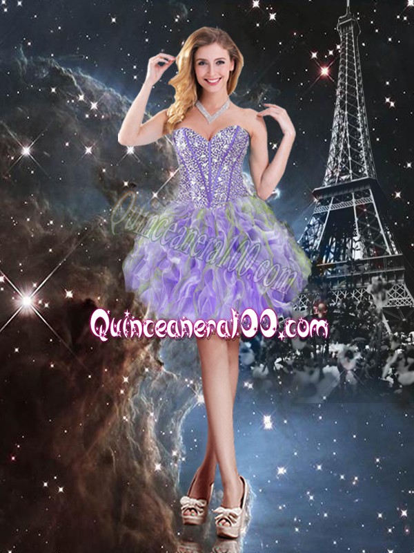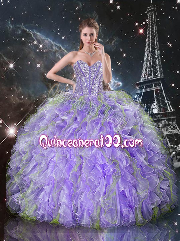 Neckline : SweetheartShown Color : LavenderSilhouette : Ball GownsSleeve Length : sleevelessHemline : floor lengthBack Detail : Lace upFabric : OrganzaEmbellishment : Beading,RufflesOccasion : Military Ball,Sweet 16,QuinceaneraSeason : Spring,Summer,Fall,Winter