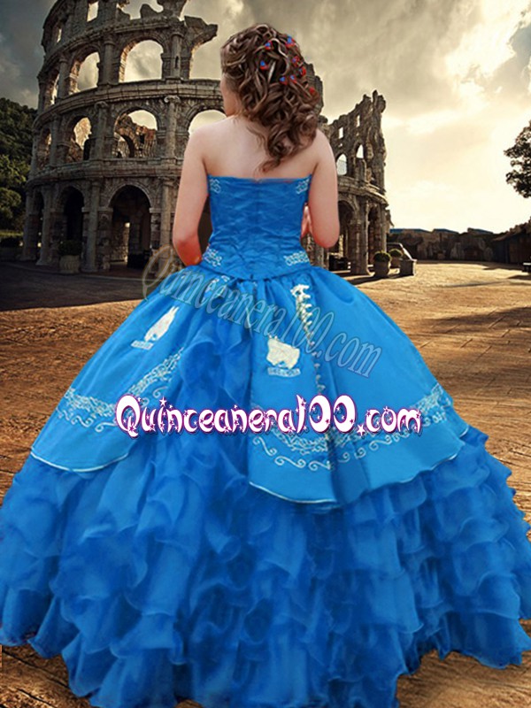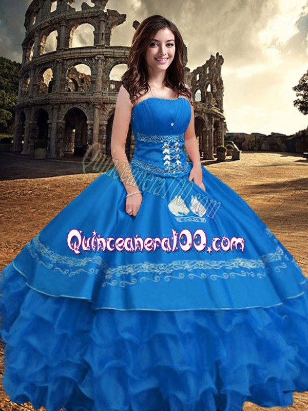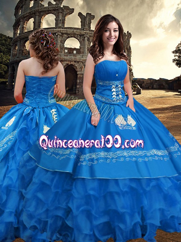 Neckline : StraplessShown Color : BlueSilhouette : Ball GownsSleeve Length : sleevelessHemline : floor lengthBack Detail : ZipperFabric : TaffetaEmbellishment : Embroidery,Ruffled LayersOccasion : Military Ball,Sweet 16,QuinceaneraSeason : Spring,Summer,Fall,Winter