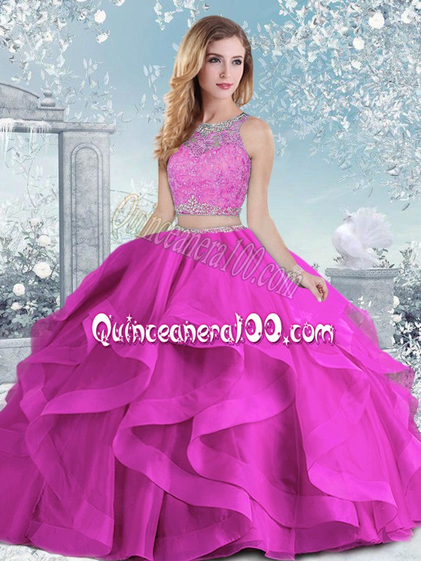 Neckline : ScoopShown Color : FuchsiaSilhouette : Ball GownsSleeve Length : sleevelessHemline : floor lengthBack Detail : Clasp handleFabric : OrganzaEmbellishment : Beading,RufflesOccasion : Military Ball,Sweet 16,QuinceaneraSeason : Spring,Summer,Fall,Winter