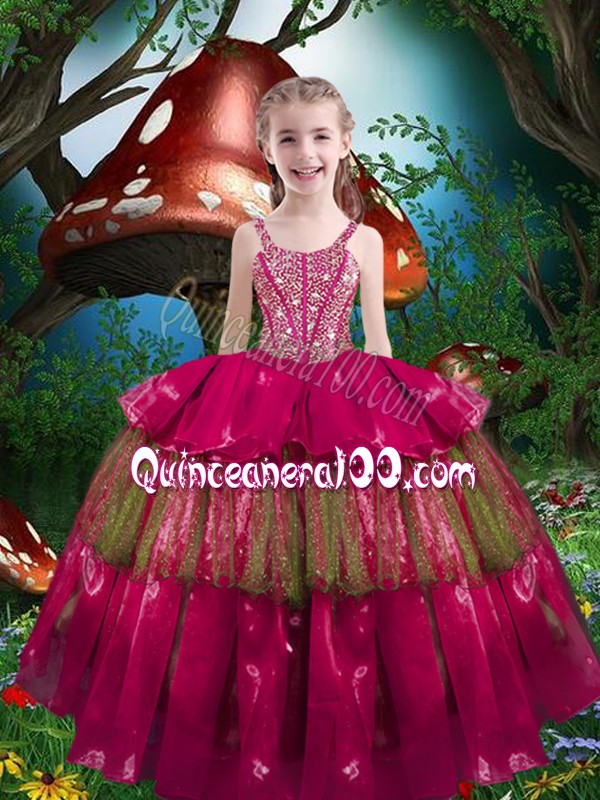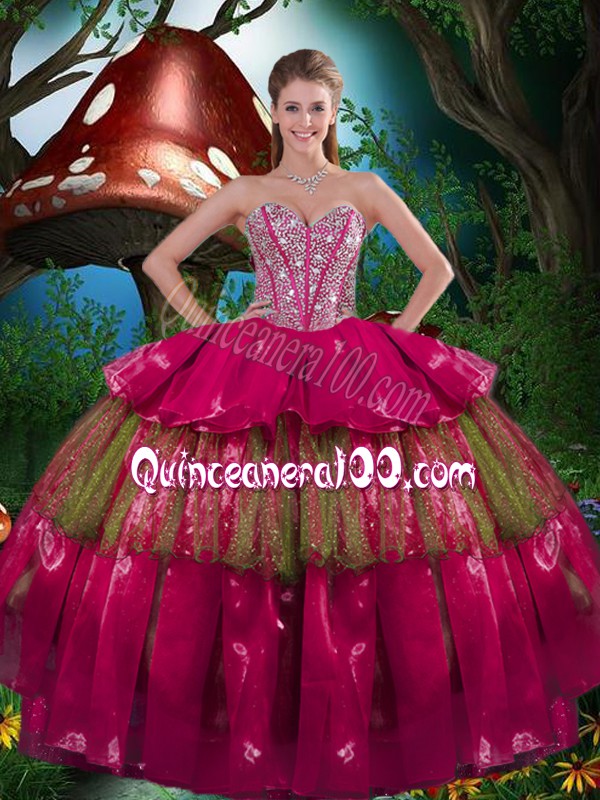 Neckline : SweetheartShown Color : FuchsiaSilhouette : Ball GownsSleeve Length : sleevelessHemline : floor lengthBack Detail : Lace upFabric : OrganzaEmbellishment : Beading,Ruffled LayersOccasion : Military Ball,Sweet 16,QuinceaneraSeason : Spring,Summer,Fall,Winter