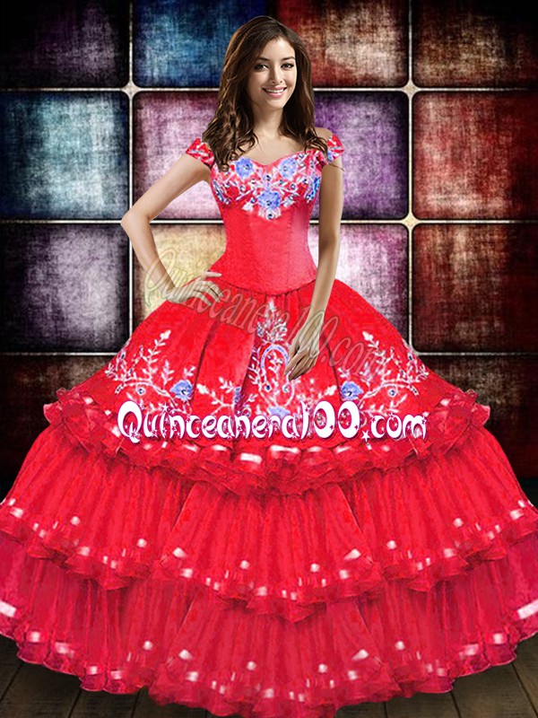 Neckline : Off the shoulderShown Color : Coral RedSilhouette : Ball GownsSleeve Length : sleevelessHemline : floor lengthBack Detail : Lace upFabric : TaffetaEmbellishment : Embroidery,Ruffled LayersOccasion : Military Ball,Sweet 16,QuinceaneraSeason : Spring,Summer,Fall,Winter