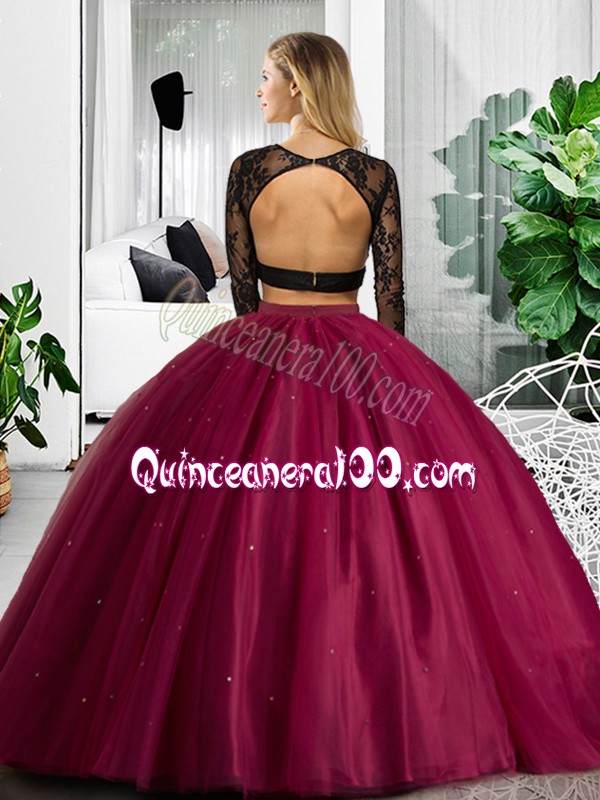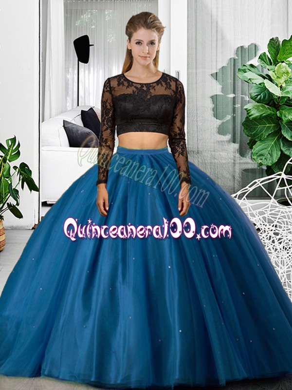 Neckline : ScoopShown Color : BlueSilhouette : Two PiecesSleeve Length : long sleevesHemline : floor lengthBack Detail : BacklessFabric : TulleEmbellishment : Lace,RuchingOccasion : Military Ball,Sweet 16,QuinceaneraSeason : Spring,Summer,Fall,Winter