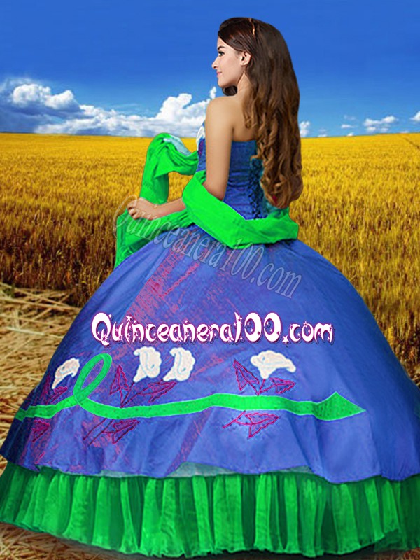 Neckline : SweetheartShown Color : Multi-colorSilhouette : Ball GownsSleeve Length : sleevelessHemline : floor lengthBack Detail : Lace upFabric : TaffetaEmbellishment : EmbroideryOccasion : Military Ball,Sweet 16,QuinceaneraSeason : Spring,Summer,Fall,Winter