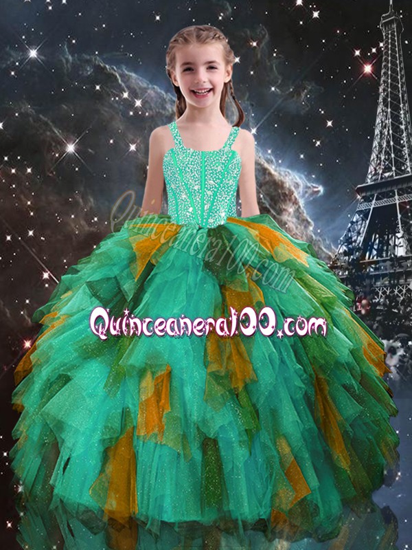 Neckline : StrapsShown Color : TurquoiseSilhouette : Ball GownsSleeve Length : sleevelessHemline : floor lengthBack Detail : Lace upFabric : TulleEmbellishment : Beading,RufflesOccasion : Quinceanera,Wedding PartySeason : Spring,Summer,Fall,Winter
