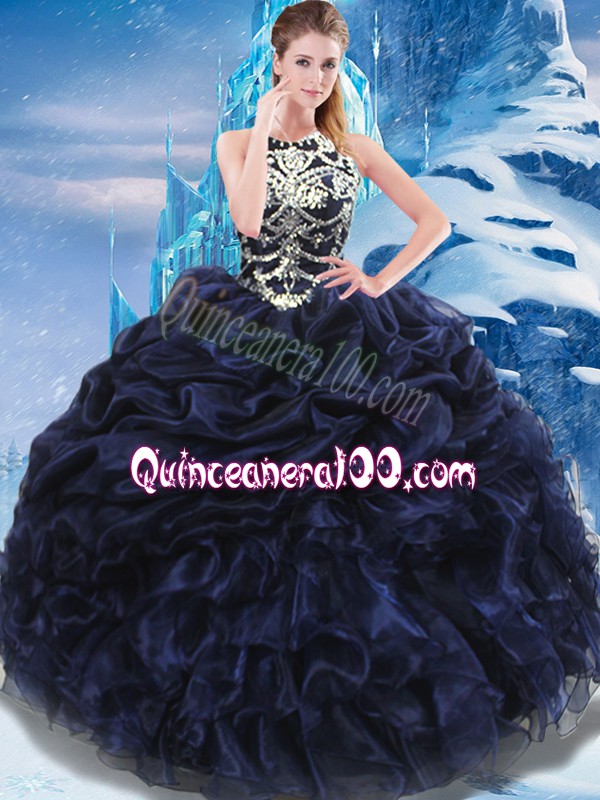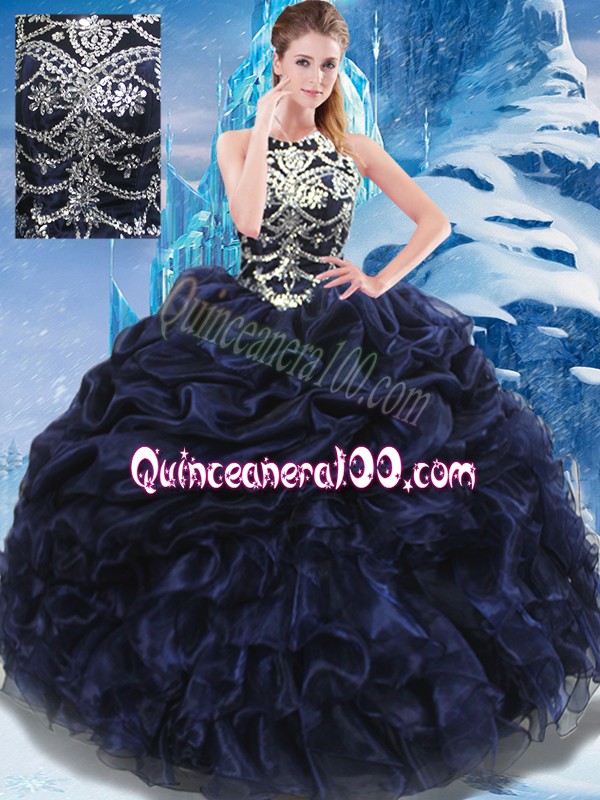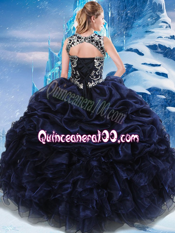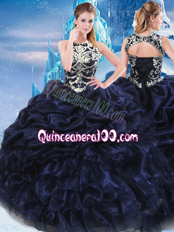 Neckline : High-neckShown Color : Navy BlueSilhouette : Ball GownsSleeve Length : sleevelessHemline : floor lengthBack Detail : Lace upFabric : TaffetaEmbellishment : Appliques,Ruffles,Pick UpsOccasion : Military Ball,Sweet 16,QuinceaneraSeason : Spring,Summer,Fall,Winter