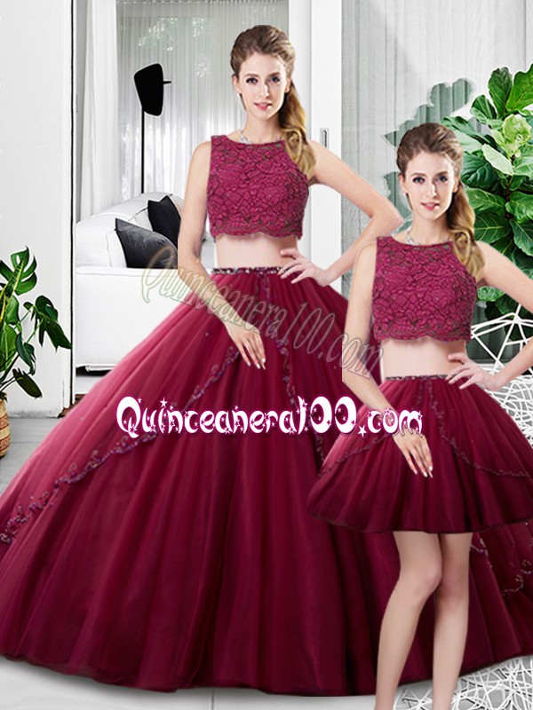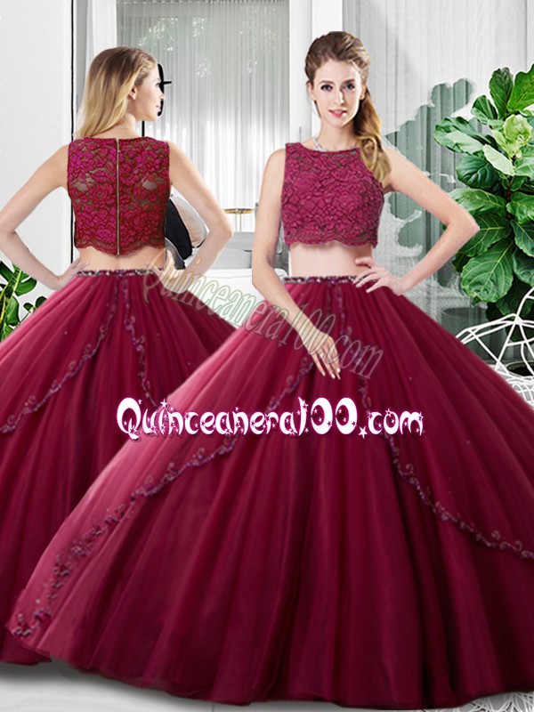 Neckline : ScoopShown Color : FuchsiaSilhouette : Three PiecesSleeve Length : sleevelessHemline : floor lengthBack Detail : ZipperFabric : TulleEmbellishment : Lace,RuchingOccasion : Military Ball,Sweet 16,QuinceaneraSeason : Spring,Summer,Fall,Winter