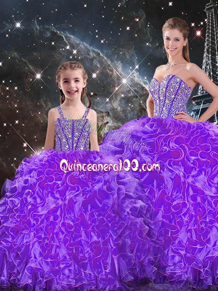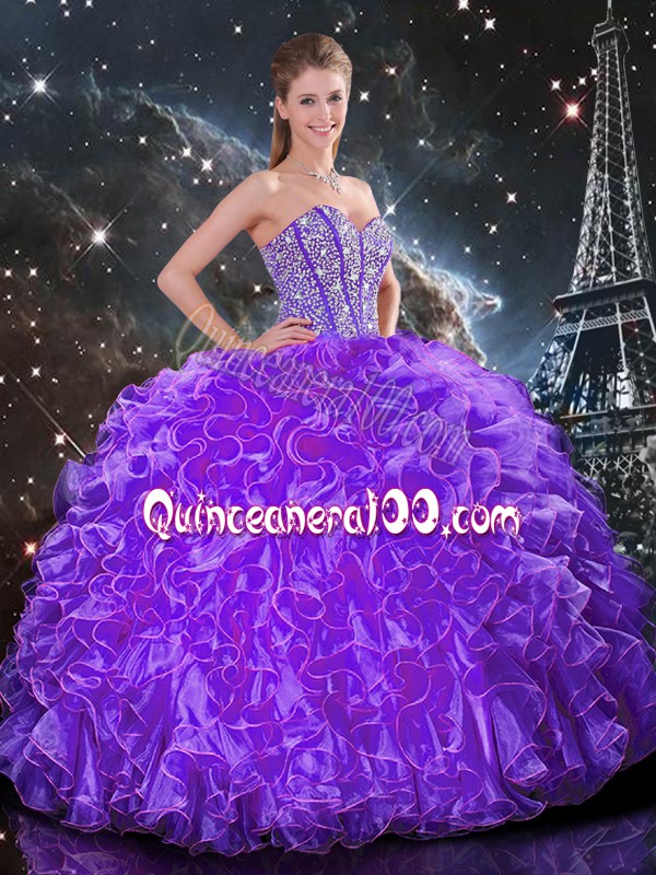 Neckline : SweetheartShown Color : Eggplant PurpleSilhouette : Ball GownsSleeve Length : sleevelessHemline : floor lengthBack Detail : Lace upFabric : OrganzaEmbellishment : Beading,RufflesOccasion : Military Ball,Sweet 16,QuinceaneraSeason : Spring,Summer,Fall,Winter