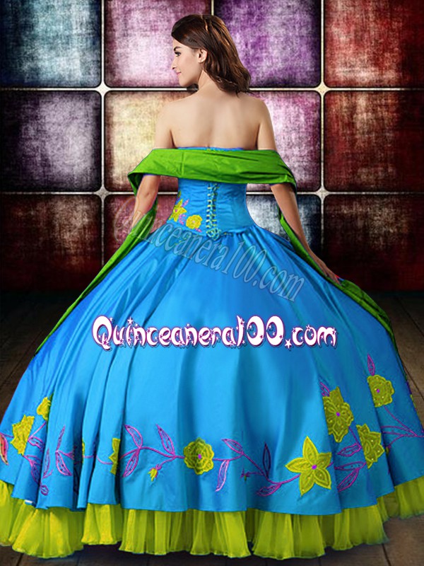 Neckline : StraplessShown Color : Multi-colorSilhouette : Ball GownsSleeve Length : sleevelessHemline : floor lengthBack Detail : Lace upFabric : SatinEmbellishment : EmbroideryOccasion : Military Ball,Sweet 16,QuinceaneraSeason : Spring,Summer,Fall,Winter