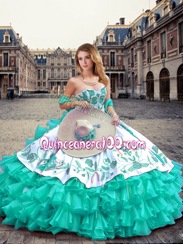 Neckline : SweetheartShown Color : TurquoiseSilhouette : Ball GownsSleeve Length : sleevelessHemline : floor lengthBack Detail : Lace upFabric : Organza,TaffetaEmbellishment : Embroidery,Ruffled LayersOccasion : Military Ball,Sweet 16,QuinceaneraSeason : Spring,Summer,Fall,Winter