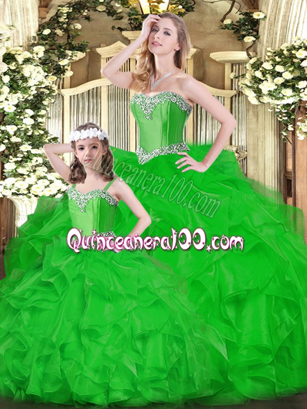 Neckline : SweetheartShown Color : GreenSilhouette : Ball GownsSleeve Length : sleevelessHemline : floor lengthBack Detail : Lace upFabric : OrganzaEmbellishment : RufflesOccasion : Military Ball,Sweet 16,QuinceaneraSeason : Spring,Summer,Fall,Winter