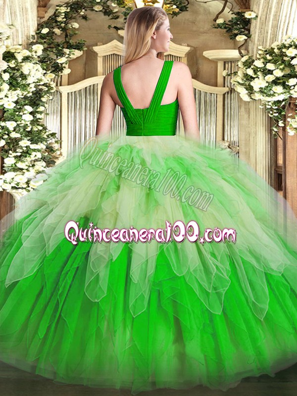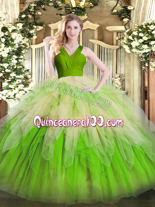 Neckline : V-neckShown Color : Multi-colorSilhouette : Ball GownsSleeve Length : sleevelessHemline : floor lengthBack Detail : ZipperFabric : OrganzaEmbellishment : RufflesOccasion : Military Ball,Sweet 16,QuinceaneraSeason : Spring,Summer,Fall,Winter