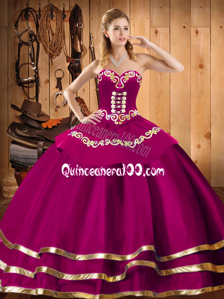 Neckline : SweetheartShown Color : FuchsiaSilhouette : Ball GownsSleeve Length : sleevelessHemline : floor lengthBack Detail : Lace upFabric : OrganzaEmbellishment : EmbroideryOccasion : Military Ball,Sweet 16,QuinceaneraSeason : Spring,Summer,Fall,Winter
