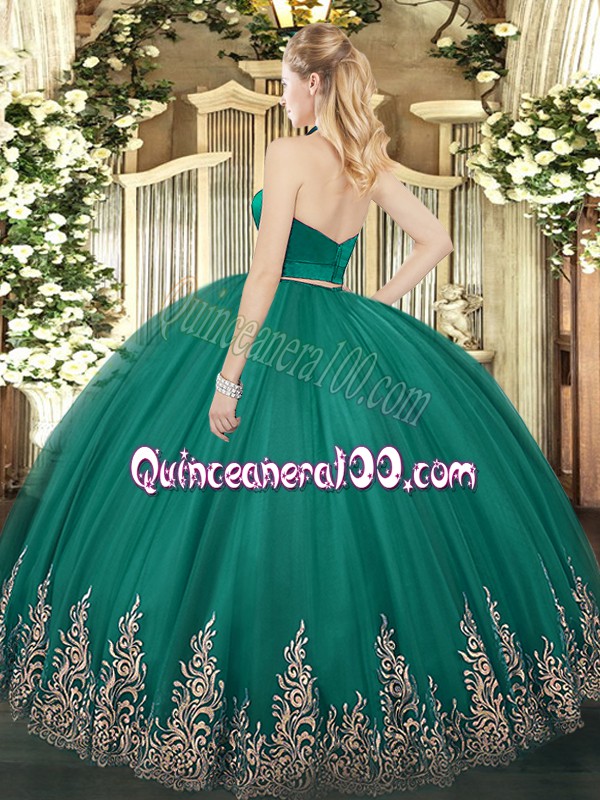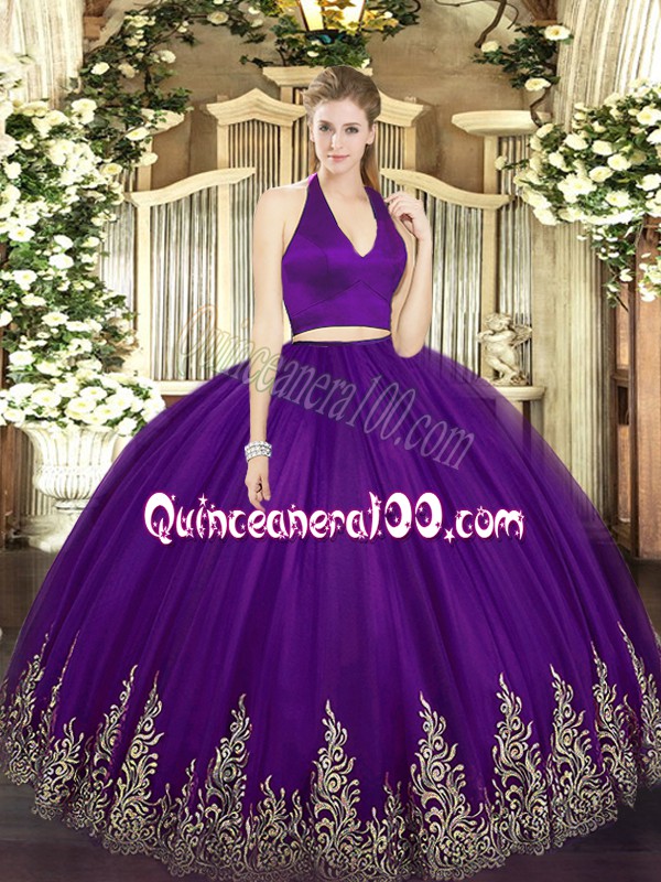 Neckline : Halter topShown Color : Dark PurpleSilhouette : Two PiecesSleeve Length : sleevelessHemline : floor lengthBack Detail : ZipperFabric : TulleEmbellishment : AppliquesOccasion : Military Ball,Sweet 16,QuinceaneraSeason : Spring,Summer,Fall,Winter