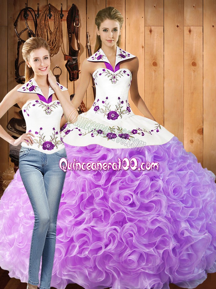 Trendy Lilac 15 Quinceanera Dress Military Ball and Sweet 16 and Quinceanera with Embroidery Halter Top Sleeveless Lace Up