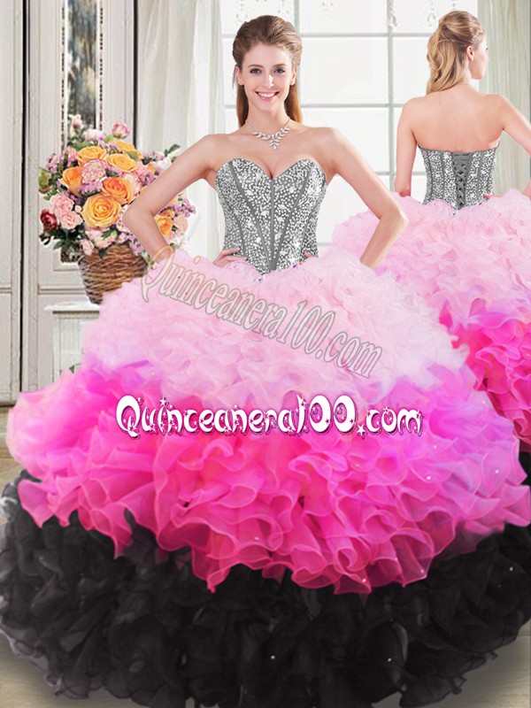 Neckline : SweetheartShown Color : Multi-colorSilhouette : Ball GownsSleeve Length : sleevelessHemline : floor lengthBack Detail : Lace upFabric : OrganzaEmbellishment : Beading,RufflesOccasion : Sweet 16,QuinceaneraSeason : Spring,Summer,Fall,Winter