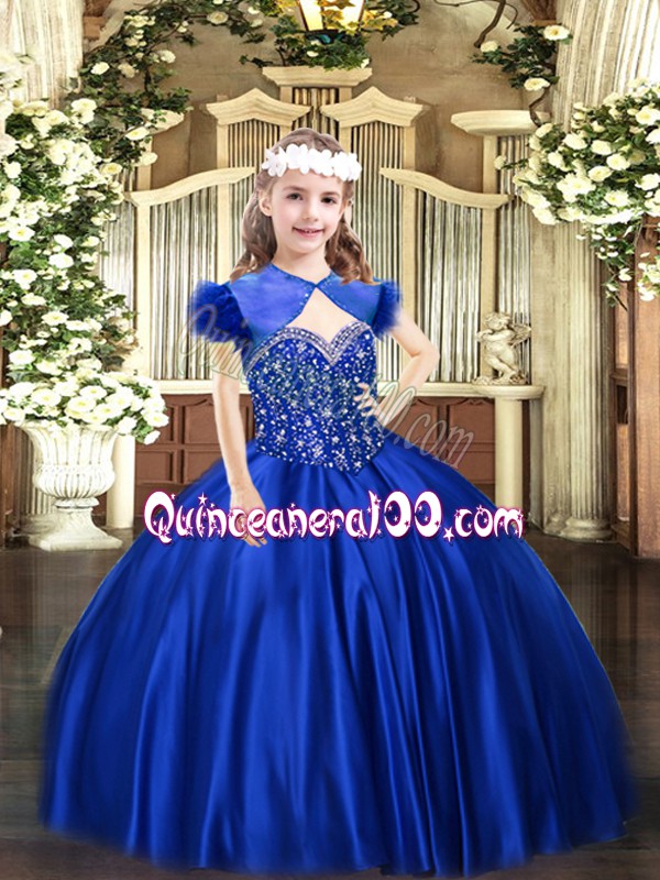 Neckline : StrapsShown Color : Royal BlueSilhouette : Ball GownsSleeve Length : sleevelessHemline : floor lengthBack Detail : Lace upFabric : SatinEmbellishment : BeadingOccasion : Party,QuinceaneraSeason : Spring,Summer,Fall,Winter