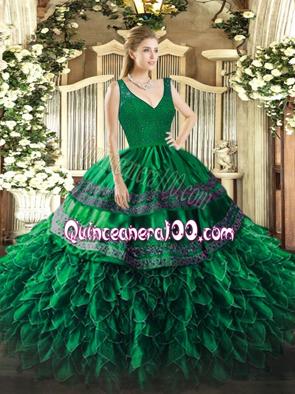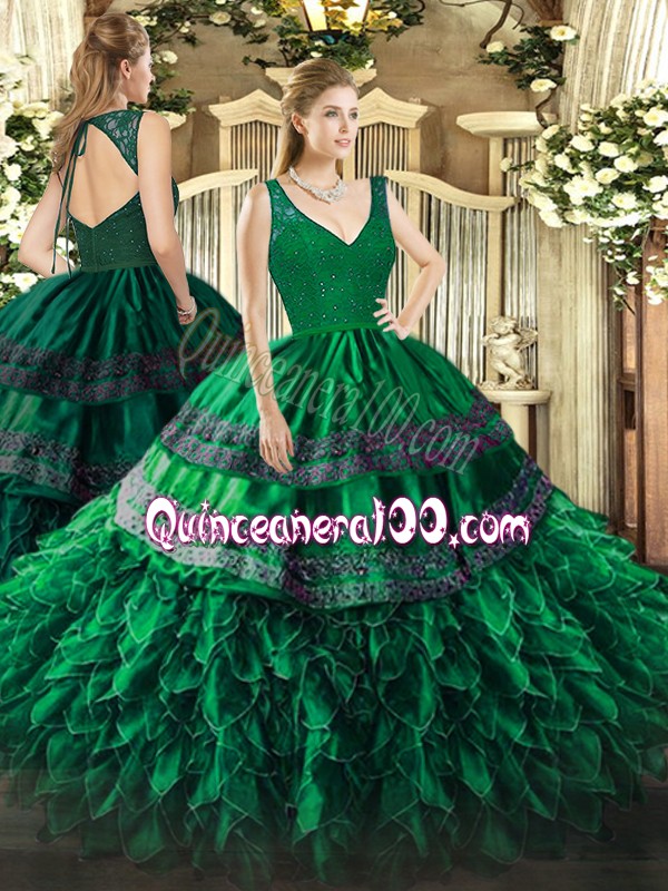 Neckline : V-neckShown Color : Dark GreenSilhouette : Ball GownsSleeve Length : sleevelessHemline : floor lengthBack Detail : ZipperFabric : OrganzaEmbellishment : Beading,RufflesOccasion : Sweet 16,QuinceaneraSeason : Spring,Summer,Fall,Winter