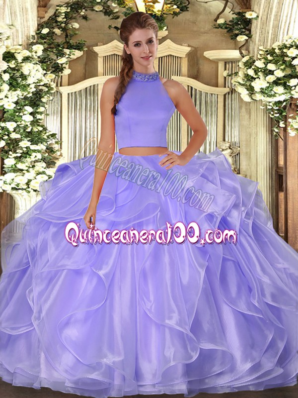 Neckline : Halter topShown Color : LavenderSilhouette : Two PiecesSleeve Length : sleevelessHemline : floor lengthBack Detail : Side zipperFabric : OrganzaEmbellishment : Beading,RufflesOccasion : Military Ball,Sweet 16,QuinceaneraSeason : Spring,Summer,Fall,Winter
