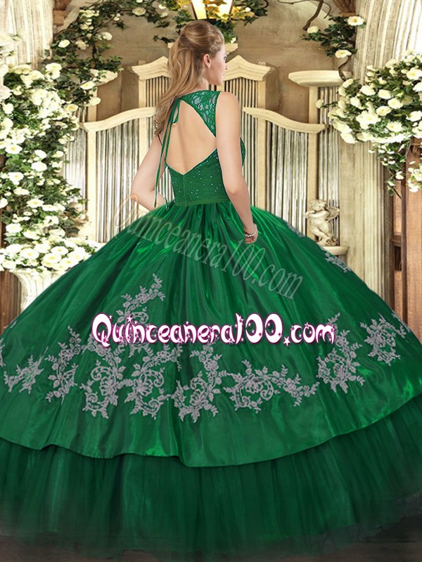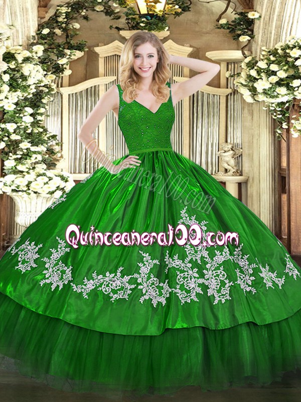 Neckline : V-neckShown Color : GreenSilhouette : Ball GownsSleeve Length : sleevelessHemline : floor lengthBack Detail : ZipperFabric : TaffetaEmbellishment : Beading,AppliquesOccasion : Sweet 16,QuinceaneraSeason : Spring,Summer,Fall,Winter