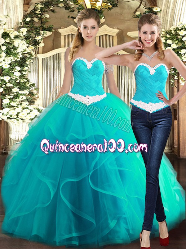 Neckline : SweetheartShown Color : TurquoiseSilhouette : Ball GownsSleeve Length : sleevelessHemline : floor lengthBack Detail : Lace upFabric : TulleEmbellishment : RufflesOccasion : Military Ball,Sweet 16,QuinceaneraSeason : Spring,Summer,Fall,Winter
