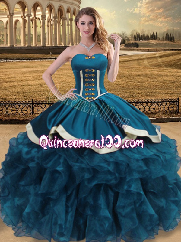 Neckline : SweetheartShown Color : Teal Silhouette : Ball GownsSleeve Length : sleevelessHemline : floor lengthBack Detail : Lace upFabric : OrganzaEmbellishment : Beading,RufflesOccasion : Sweet 16,QuinceaneraSeason : Spring,Summer,Fall,Winter