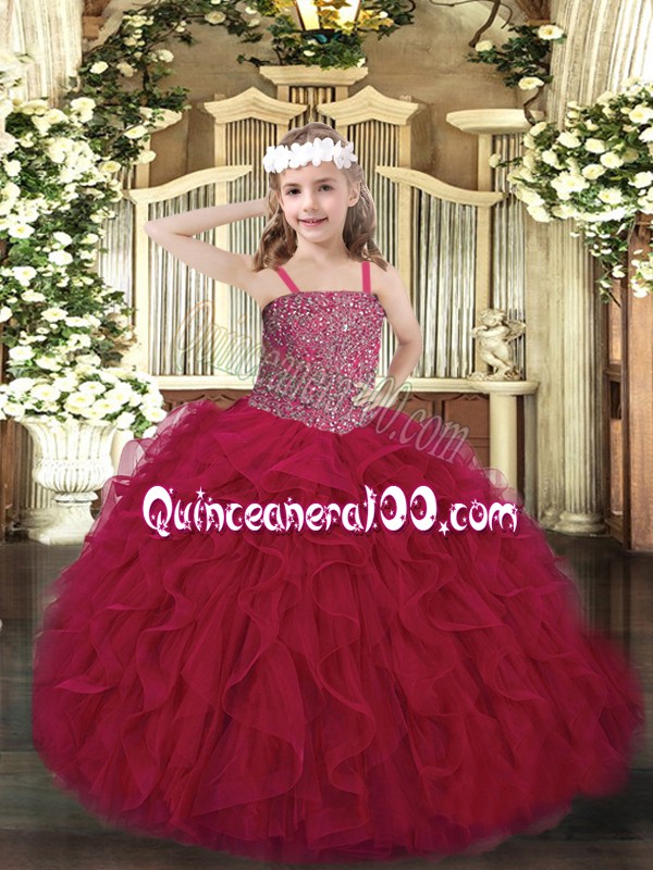 Neckline : StrapsShown Color : Wine RedSilhouette : Ball GownsSleeve Length : sleevelessHemline : floor lengthBack Detail : Lace upFabric : TulleEmbellishment : Beading,RufflesOccasion : Party,QuinceaneraSeason : Spring,Summer,Fall,Winter
