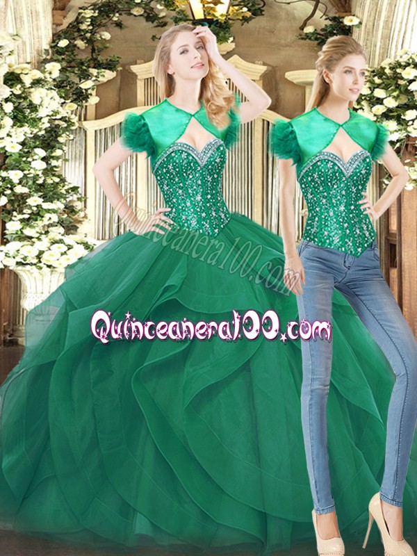 Neckline : SweetheartShown Color : Dark GreenSilhouette : Ball GownsSleeve Length : sleevelessHemline : floor lengthBack Detail : Lace upFabric : TulleEmbellishment : Beading,RufflesOccasion : Military Ball,Sweet 16,QuinceaneraSeason : Spring,Summer,Fall,Winter