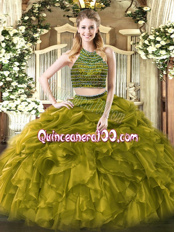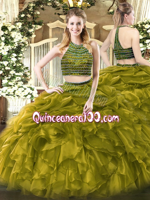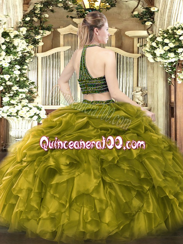 Neckline : Halter topShown Color : Olive GreenSilhouette : Two PiecesSleeve Length : sleevelessHemline : floor lengthBack Detail : ZipperFabric : TulleEmbellishment : Beading,RufflesOccasion : Military Ball,Sweet 16,QuinceaneraSeason : Spring,Summer,Fall,Winter