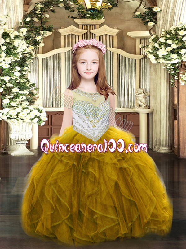 Neckline : ScoopShown Color : GoldSilhouette : Ball GownsSleeve Length : sleevelessHemline : floor lengthBack Detail : ZipperFabric : OrganzaEmbellishment : Beading,RufflesOccasion : Party,QuinceaneraSeason : Spring,Summer,Fall,Winter