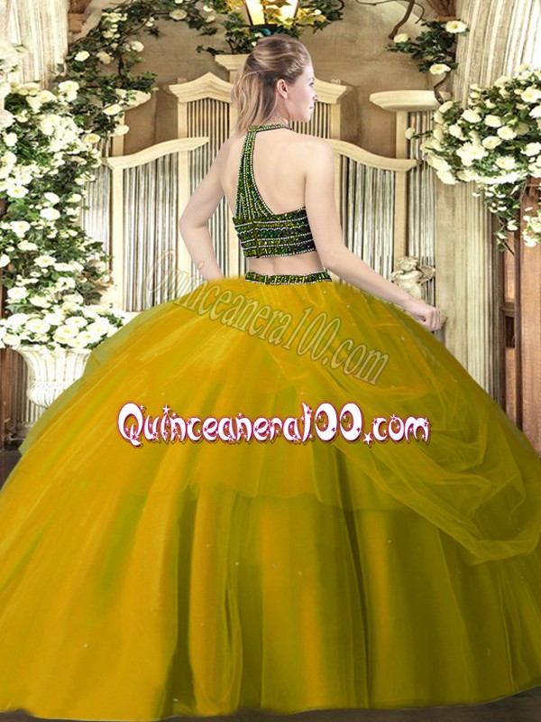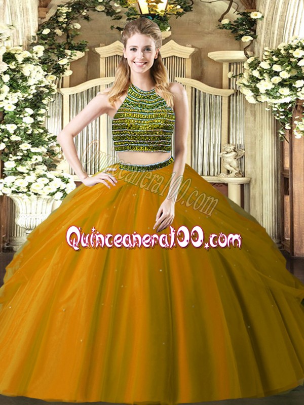 Neckline : Halter topShown Color : BrownSilhouette : Ball GownsSleeve Length : sleevelessHemline : floor lengthBack Detail : ZipperFabric : TulleEmbellishment : BeadingOccasion : Military Ball,Sweet 16,QuinceaneraSeason : Spring,Summer,Fall,Winter