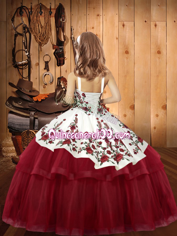 Neckline : StrapsShown Color : PurpleSilhouette : Ball GownsSleeve Length : sleevelessHemline : floor lengthBack Detail : Lace upFabric : OrganzaEmbellishment : EmbroideryOccasion : Party,Sweet 16,Quinceanera,Wedding PartySeason : Spring,Summer,Fall,Winter
