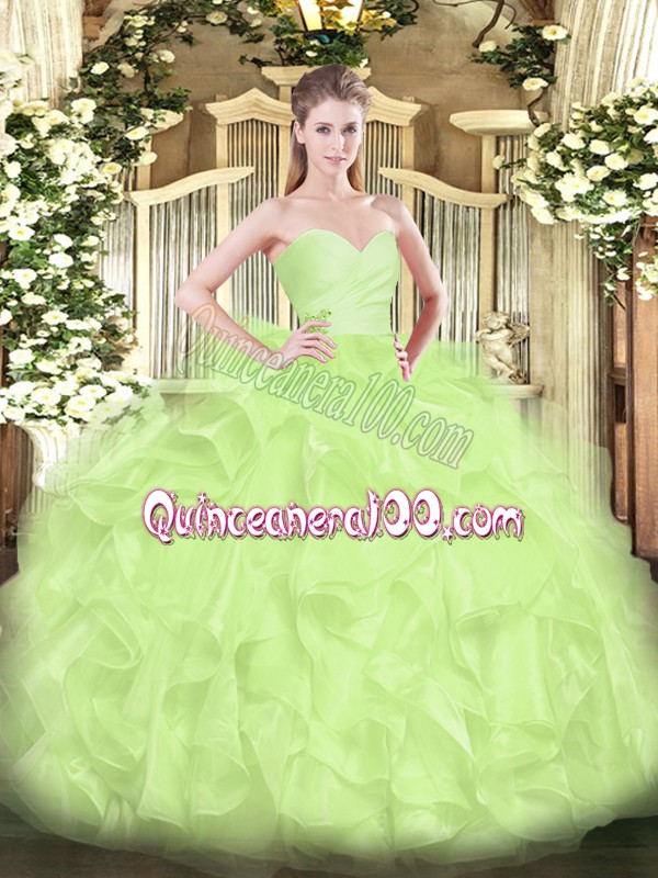Neckline : SweetheartShown Color : Yellow GreenSilhouette : Ball GownsSleeve Length : sleevelessHemline : floor lengthBack Detail : Lace upFabric : OrganzaEmbellishment : Beading,RufflesOccasion : Military Ball,Sweet 16,QuinceaneraSeason : Spring,Summer,Fall,Winter