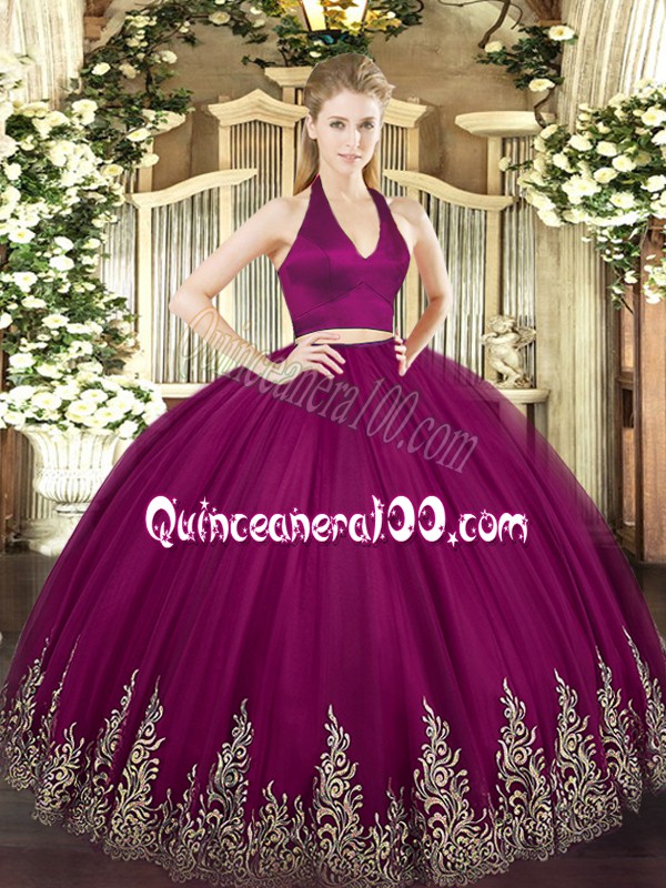 Neckline : Halter topShown Color : FuchsiaSilhouette : Two PiecesSleeve Length : sleevelessHemline : floor lengthBack Detail : ZipperFabric : TulleEmbellishment : AppliquesOccasion : Military Ball,Sweet 16,QuinceaneraSeason : Spring,Summer,Fall,Winter