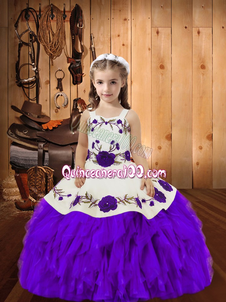 Neckline : StrapsShown Color : Eggplant PurpleSilhouette : Ball GownsSleeve Length : sleevelessHemline : floor lengthBack Detail : Lace upFabric : OrganzaEmbellishment : Embroidery,RufflesOccasion : Sweet 16,QuinceaneraSeason : Spring,Summer,Fall,Winter