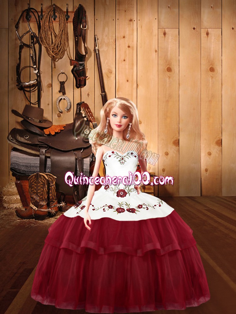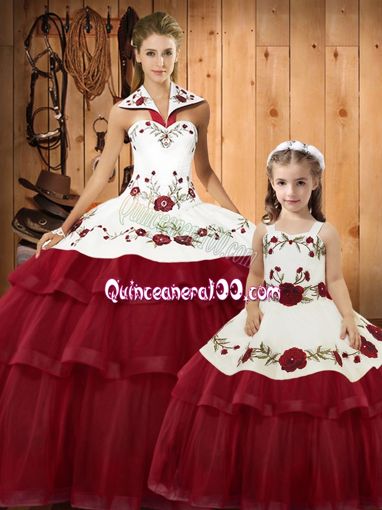 Neckline : Halter topShown Color : Wine RedSilhouette : Ball GownsSleeve Length : sleevelessBack Detail : Lace upFabric : Satin,OrganzaEmbellishment : Embroidery,Ruffled LayersOccasion : Military Ball,Sweet 16,QuinceaneraSeason : Spring,Summer,Fall,Winter